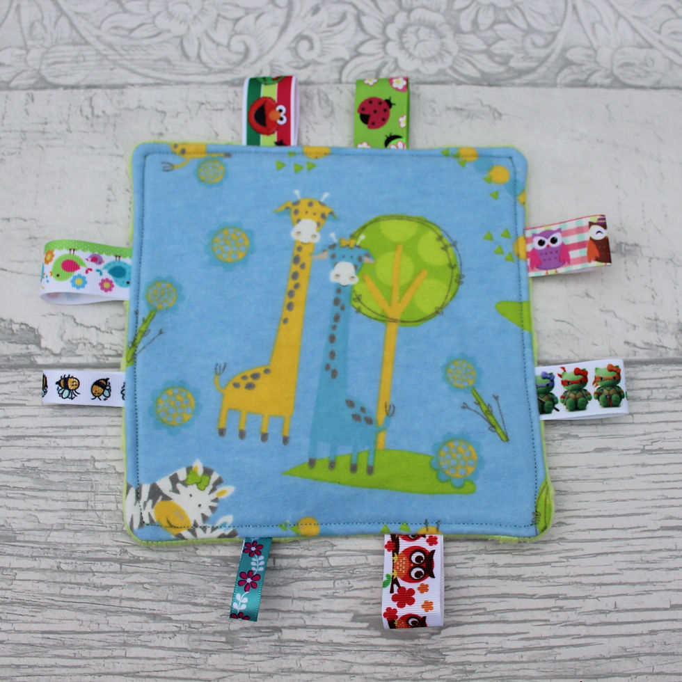Each tag square is made using 100% cotton on the front and super soft fleece on the back with plenty of sensory ribbon tags.